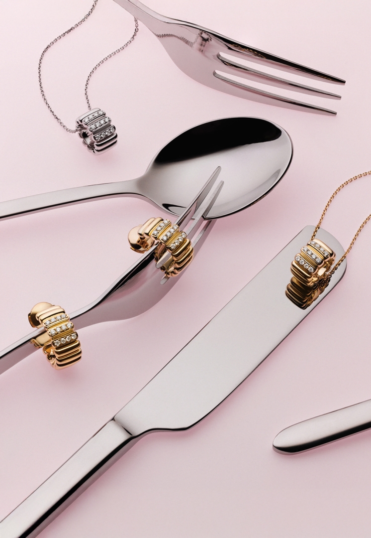 Since design feeds the mind, a woman can sweeten her day with story-based golden Savoiardi pieces. Their meticulously arranged pattern is a loud statement of her charming personality, while the soft-edged design of the "ladyfingers" will add velvety smoothness to her appearance. Another visual interpretation of the collection is the application of a crisscross layout of ladyfingers. Similarly to the multilayered texture of tiramisu, it highlights a woman’s multifaceted, alluring nature.